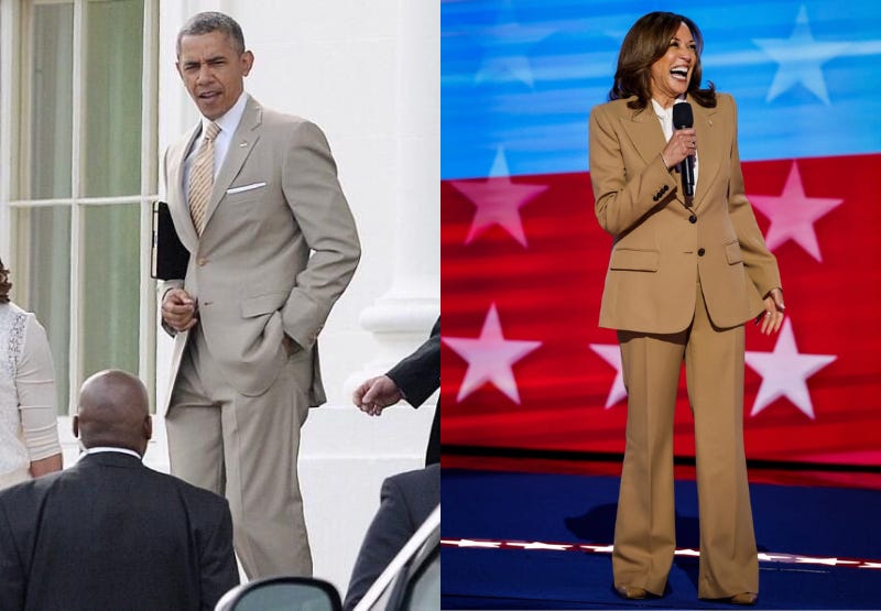 Two: Kamala Harris made a surprise appearance—ahead of her victory lap slated for Thursday—wearing a tan suit! The colour is meant as a cheeky reference to Obama’s tan suit—worn at a presidential press conference on the Middle East. Horrified Republicans called it “unpresidential.” She just can’t stop trolling them. Also: Who wore it better? We’re gonna give this one to the big O.
