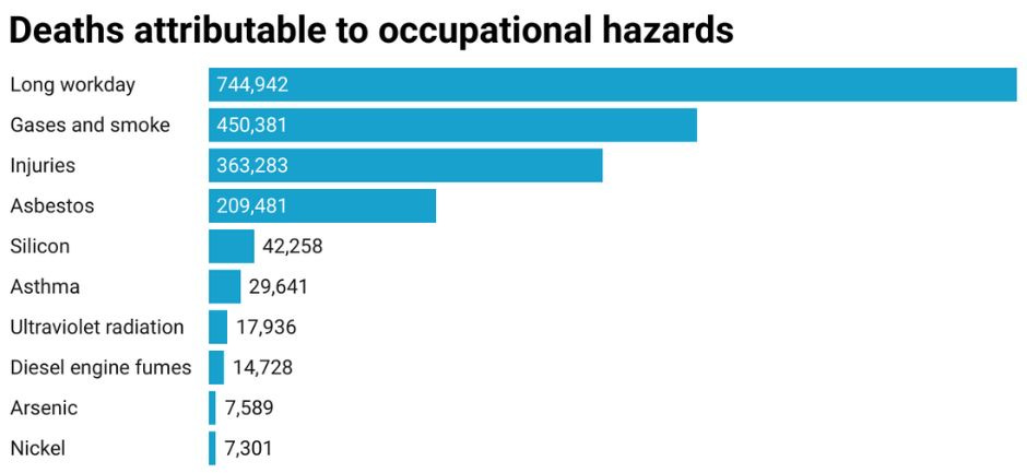 An International Labor Organization study shows that nearly 750,000 people around the world die due to overwork—defined as working more than 55 hours a week. That said, the workplace is way safer than the past—but that office job may come with an invisible price tag. According to ILO’s data, more than 13 million people around the world live with a visual impairment caused by their work. As you can plainly see in the chart below, long work hours are the #1 work-related hazard—by a mile!